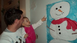 Two of the girls who attend College of Charleston (Rebekah and Ashley) painted a picture of Frosty the Snowman for decoration…Myra Grace fell in love with it…Brandon brought it home for her and it now hangs in her room. Every day before her naps and bed she says “night night” to Frosty.
