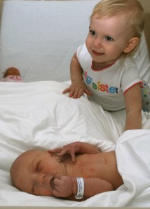 The most excited is Myra Grace. She is constantly saying “baby” wondering what he’s doing and kissing him on his head and rubbing his face.